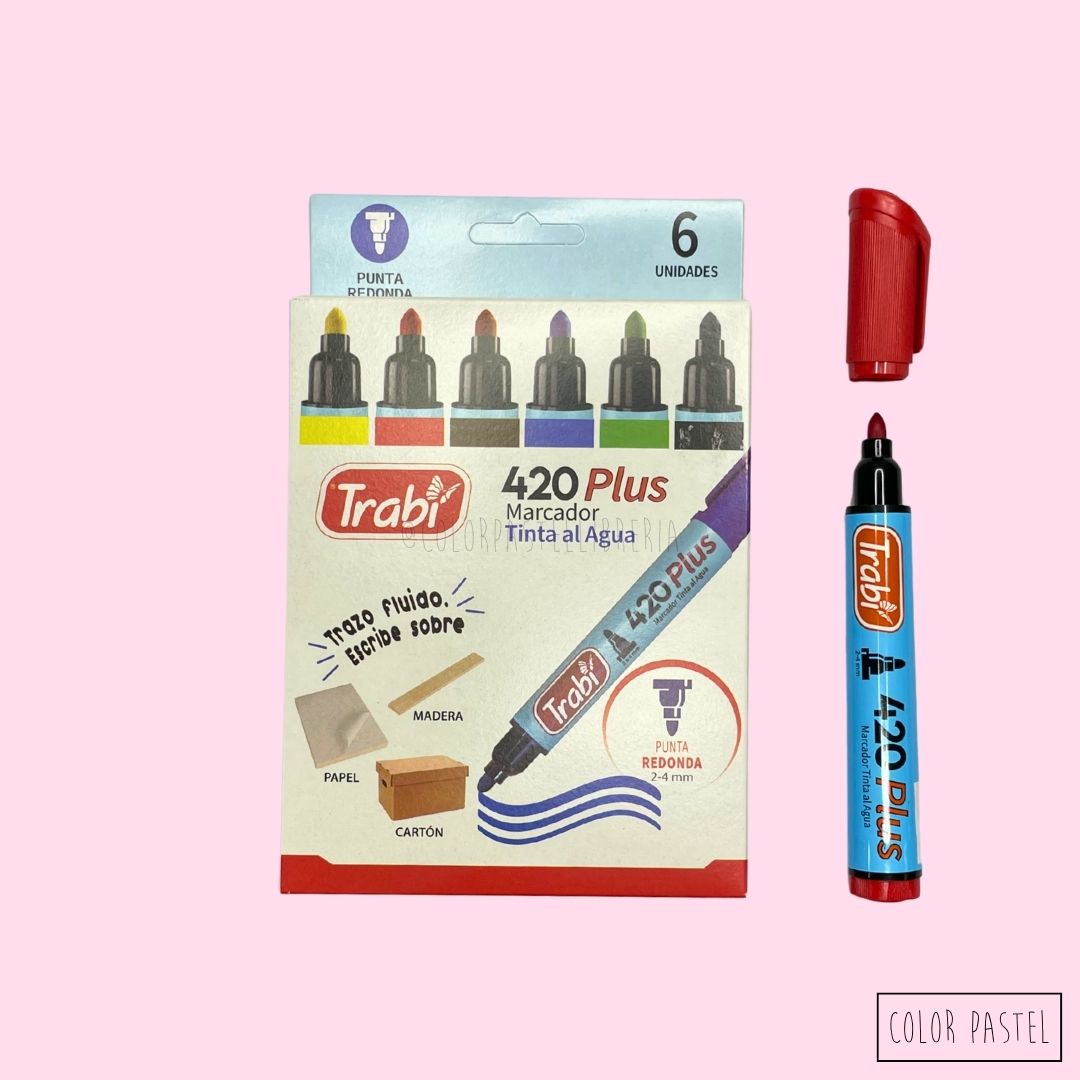 El set de marcadores 420Plus de Trabi incluye 6 colores con tinta al agua que brindan trazos suaves e intensos.